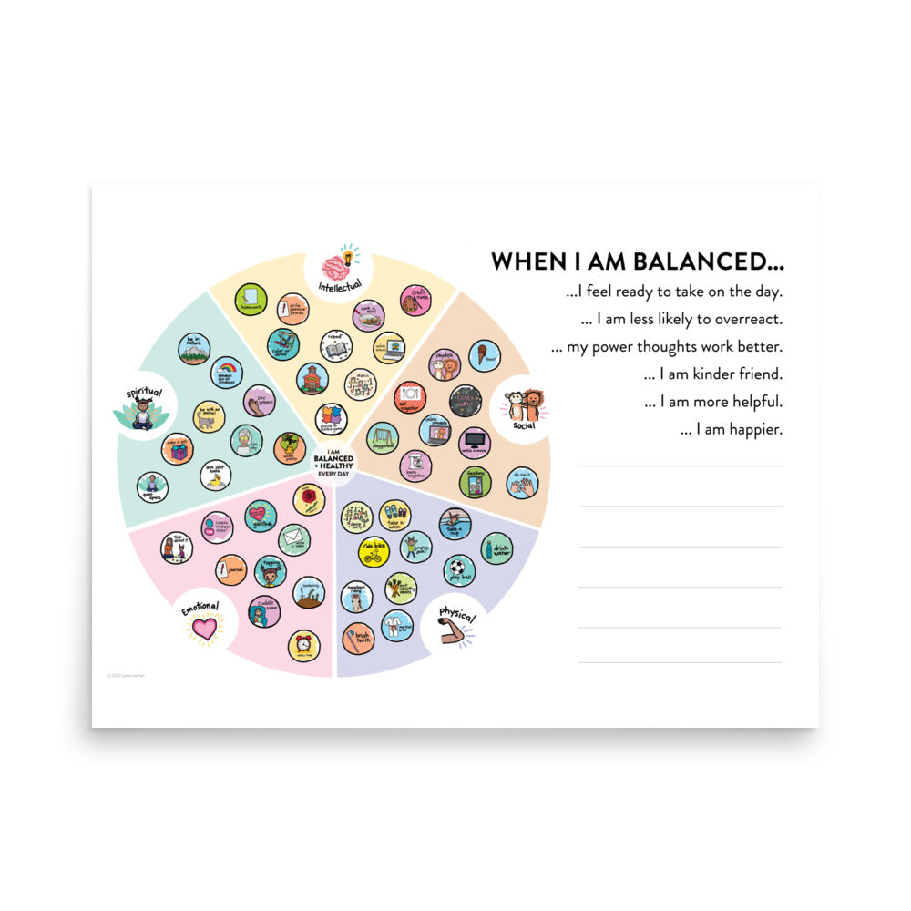 Wouldn't it be fabulous if our kids could learn the value of creating balance in their lives (and how to do it), rather than growing up overwhelmed, overcommitted, and addicted to the "hustle"? These skills start early! Based on the Dimensions of Wellness, this beautiful poster is a wonderful complement to our Kids' Mental Health Skills subscription, which teaches kids the value of caring for themselves.
